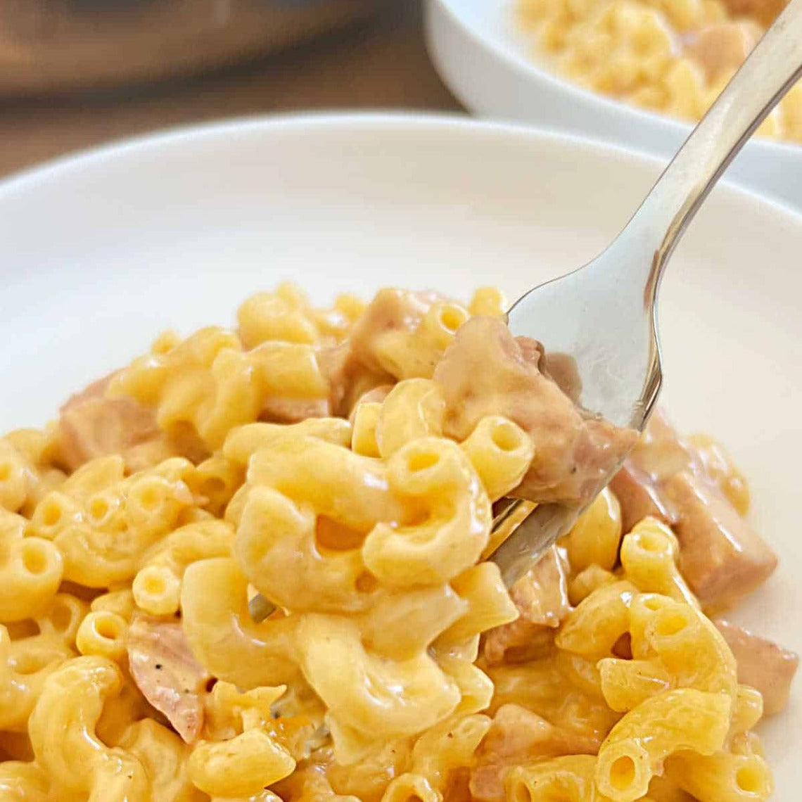 Cavatappi Pasta Water, Chicken (Chicken, Water, Spices, Natural Flavor, Isolate Soy Protein, Starch, Vinegar, Sodium Phosphate), Ham, Cheddar Cheese (Milk, Cultures, Enzymes, Salt), Swiss Cheese (Milk, Cultures, Enzymes, Salt), Non-Fat Dry Milk, Textured Soy Protein, Cellulose, Whey Protein Isolate, Spices.