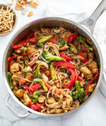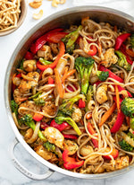 Kung Pao Lo Mein is a fiery, flavor-packed fusion that brings the wok-fired energy of a street-side stir-fry to your bowl. Tender udon noodles tangle with a vibrant medley of broccoli, bell peppers, carrots, mushrooms, sugar snap peas, and crunchy water chestnuts, all tossed in a bold blend of hoisin, gochujang, and reduced-sodium soy sauce. Juicy chicken and textured soy protein deliver a double dose of satisfying protein, while green onion, sesame seeds, and a splash of rice vinegar add brightness and crunch. Finished with a kiss of sesame oil and a kick of spice, this dish is a craveable collision of sweet, savory, and heat—perfect for powering through your day or spicing up your night.