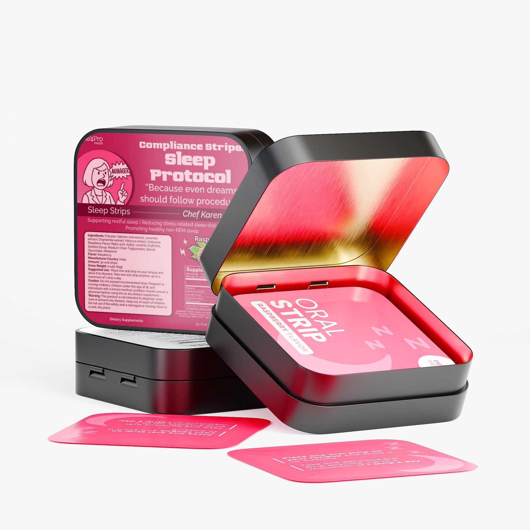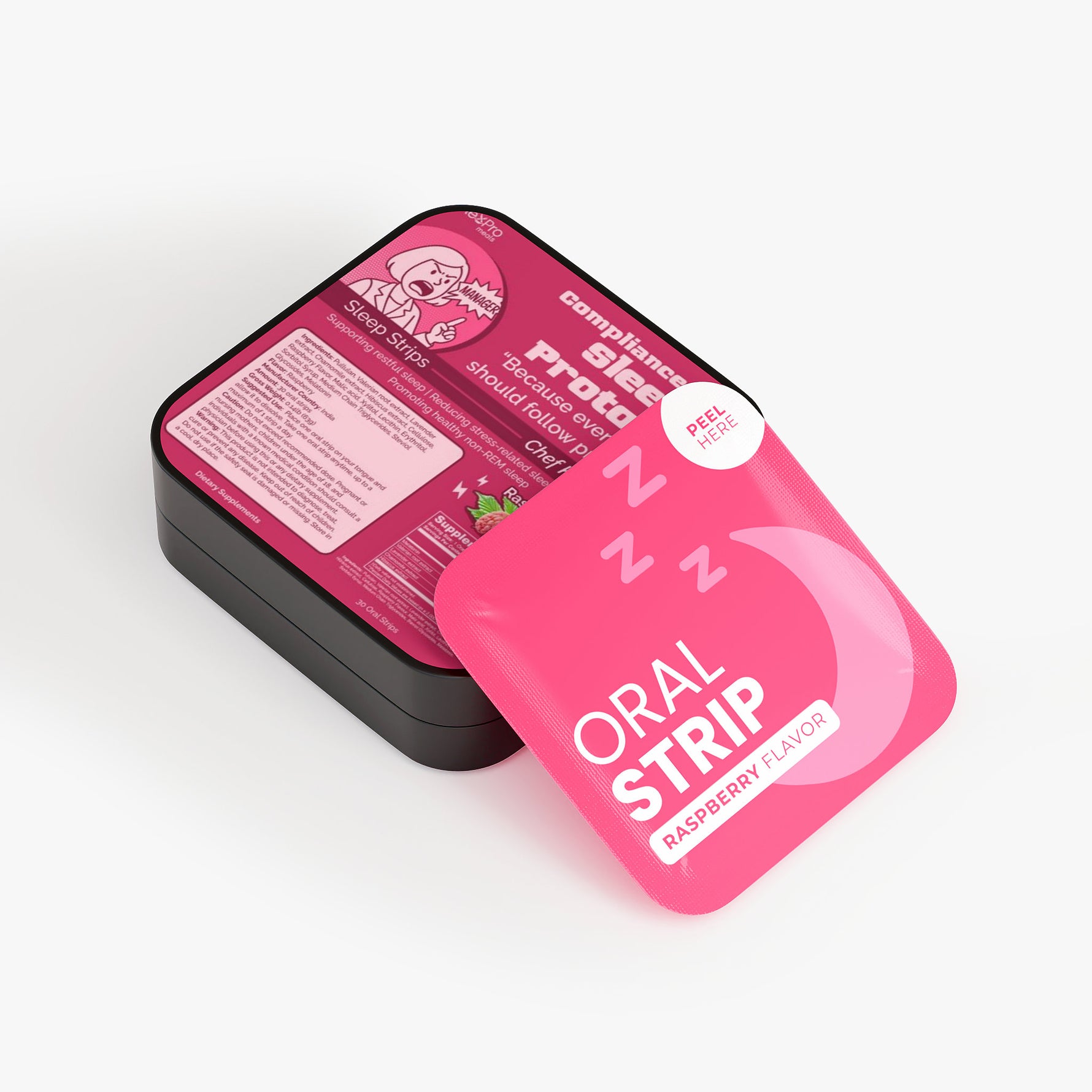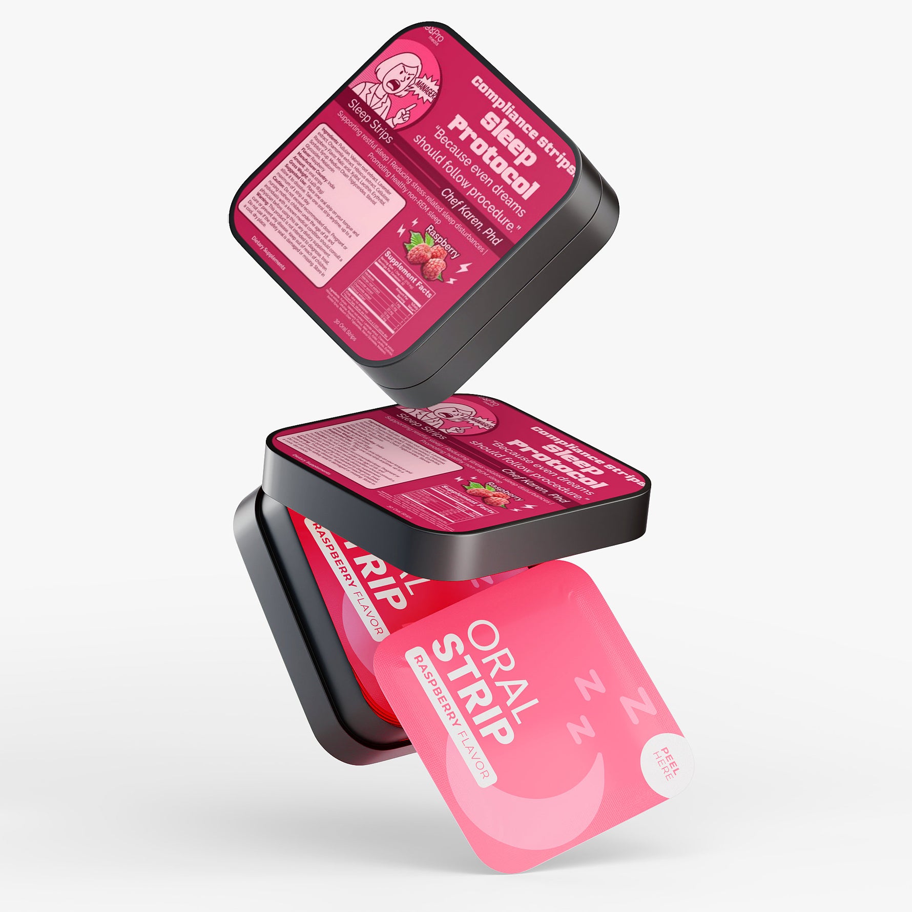 Ingredients: Pullulan, Valerian root extract, Lavender extract, Chamomile extract, Hibiscus extract, Cellulose, Raspberry Flavor, Malic acid, Xylitol, Lecithin, Erythritol, Sorbitol Syrup, Medium Chain Triglycerides, Steviol Glycosides, Melatonin